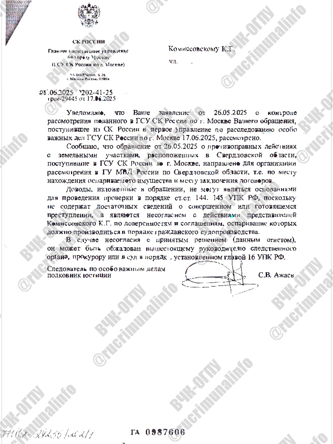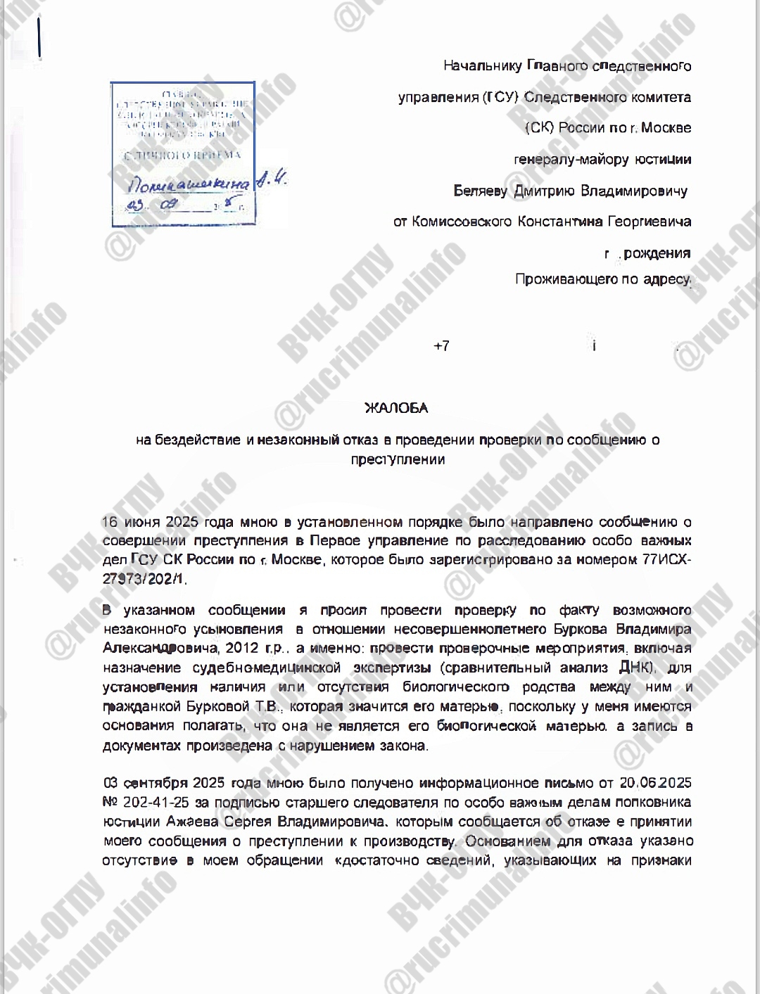 A report of possible crimes—child substitution and human trafficking—was filed with the Main Investigative Directorate of the Investigative Committee for Moscow. But then something strange began: investigator Sergei Azhaev, without interviewing the complainant, the Burkovs, or ordering an examination, closed the case "due to lack of evidence of a crime."
