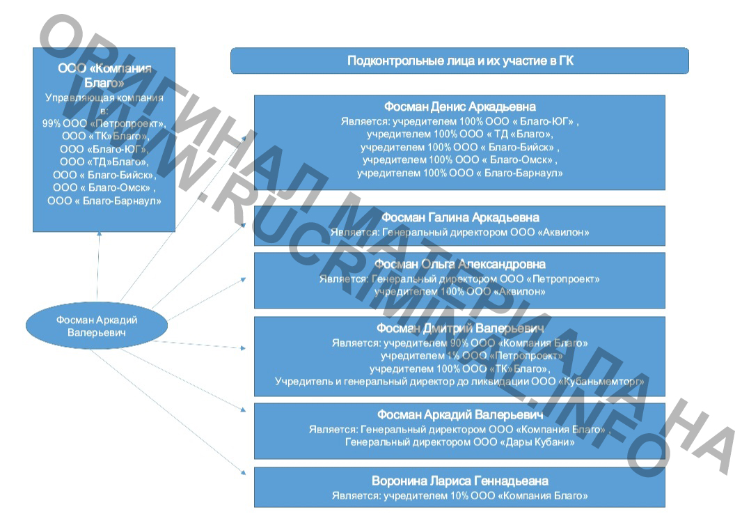 Так же в этот промежуток времени руководитель ООО «Аквилон» (ИНН 2310165912, Учредитель – Фосман Ольга, управляющая компания — ООО «Компания Благо» директор которой Фосман Аркадий Валерьевич) ведя хозяйственную деятельность наносила ущерб бюджету Российской Федерации предположительно по следующей схеме, в период закупки сырья 2014-2015, 2015-2016, 2016-2017 ориентировочно закуплено 1 000 000 тонн по цене около 20 000 за 1 килограмм на общую сумму 20 млрд. руб.