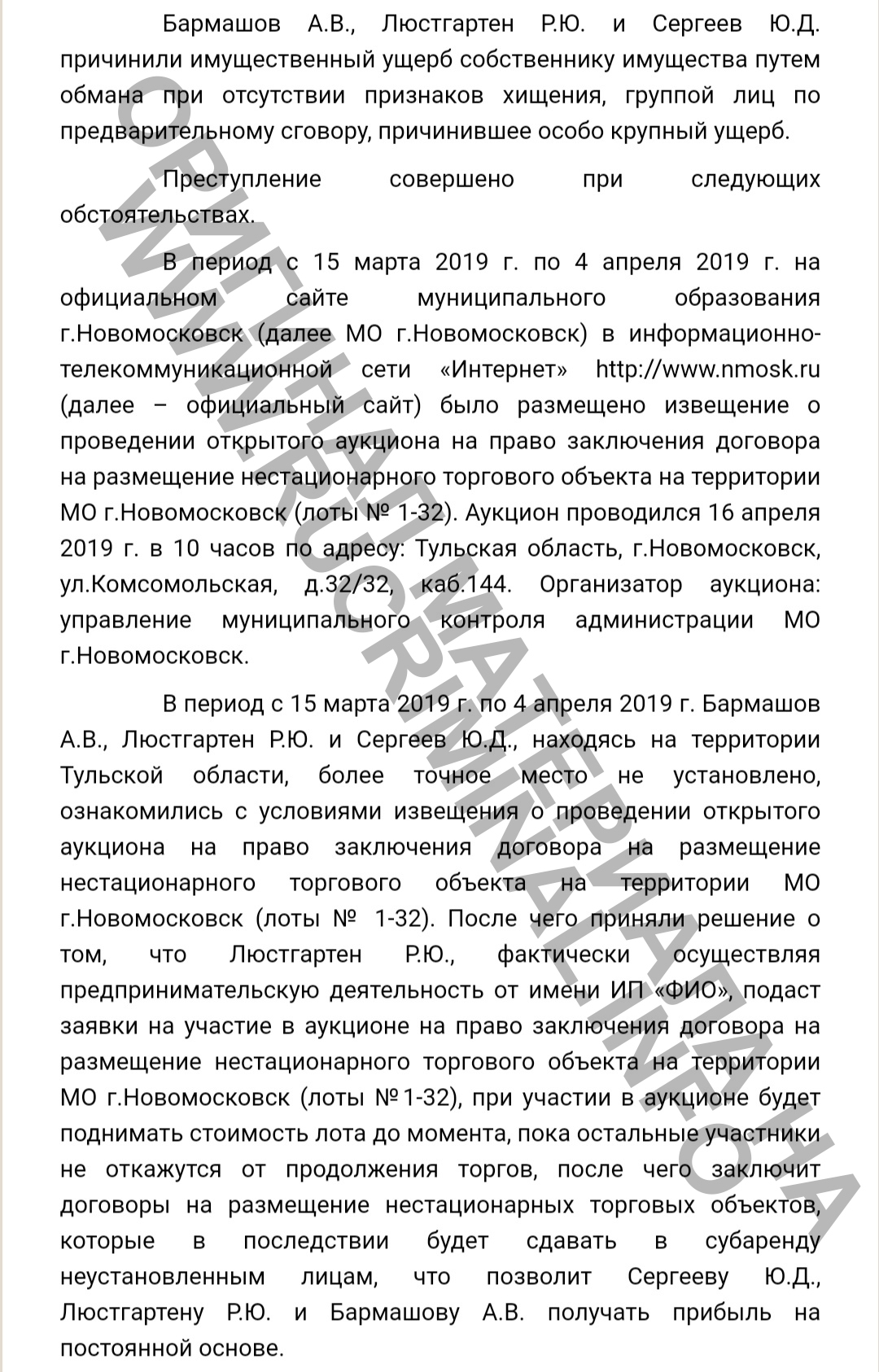 Затем тульские следователи неожиданно упустили из внимания тот факт, что Андрей Бармашов на момент совершения преступления являлся муниципальным служащим. А ведь заявки на участие в открытом аукционе по продаже права на заключение договора на размещение нестационарного торгового объекта на территории МО г.Новомосковск подельники подавали в подразделение администрации возглавляемое именно Бармашовым. В должностные обязанности которого и входил контроль за поступлением денег в муниципальный бюджет.