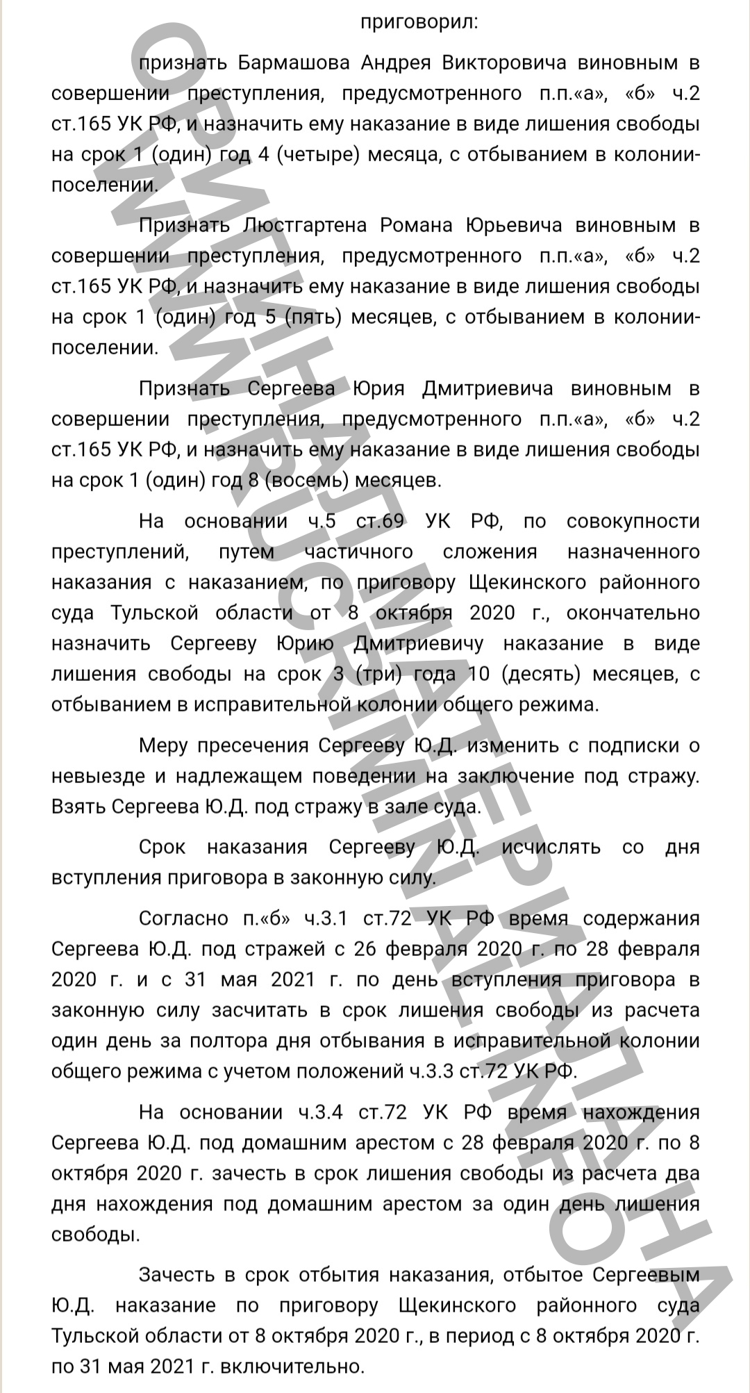 В конце мая этого года Новомосковский городской суд Тульской области признал виновными в совершении преступления, предусмотренного пунктами «а» и «б» ч.2 ст.165 УК РФ (причинение имущественного ущерба) бывшего начальника управления муниципального контроля администрации Новомосковска Андреем Бармашова и двух бизнесменов- Романа Люстгартена и Юрия Сергеева.