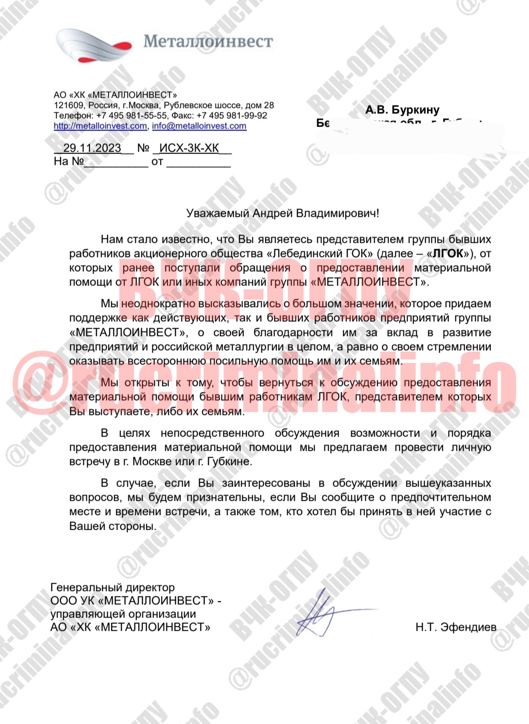 Такое предложение было сделано Алексом Туманяном и Сергеем Чибисовым (представители Металлоинвеста) на встрече с Андреем Буркиным в гостинице Континенталь в городе Белгород 07 декабря 2023 года. Но в сфабрикованном деле отсутствует сам факт неуспешных переговоров на которые Буркина пригласил (или заманил) лично Назим Эфендиев, генеральный директор Металлоинвеста!