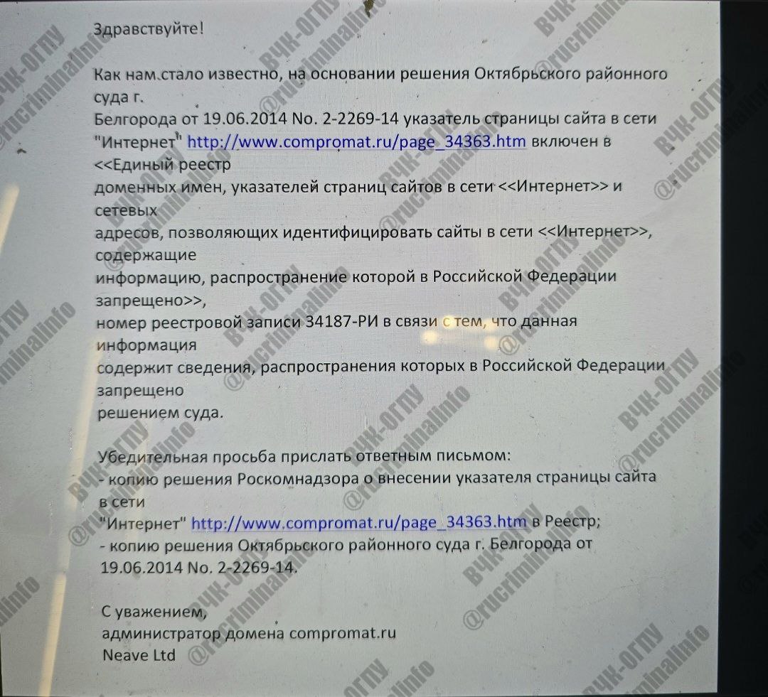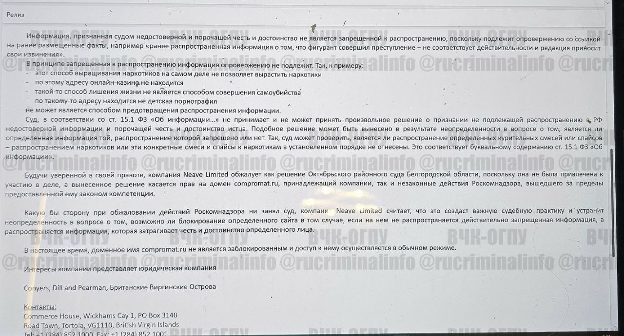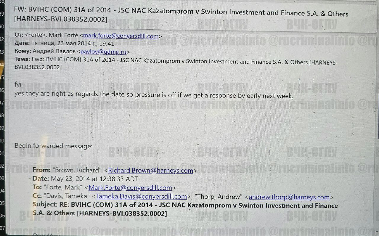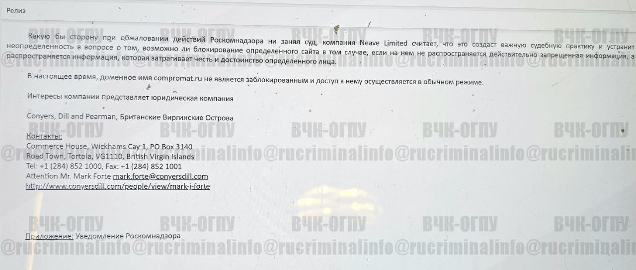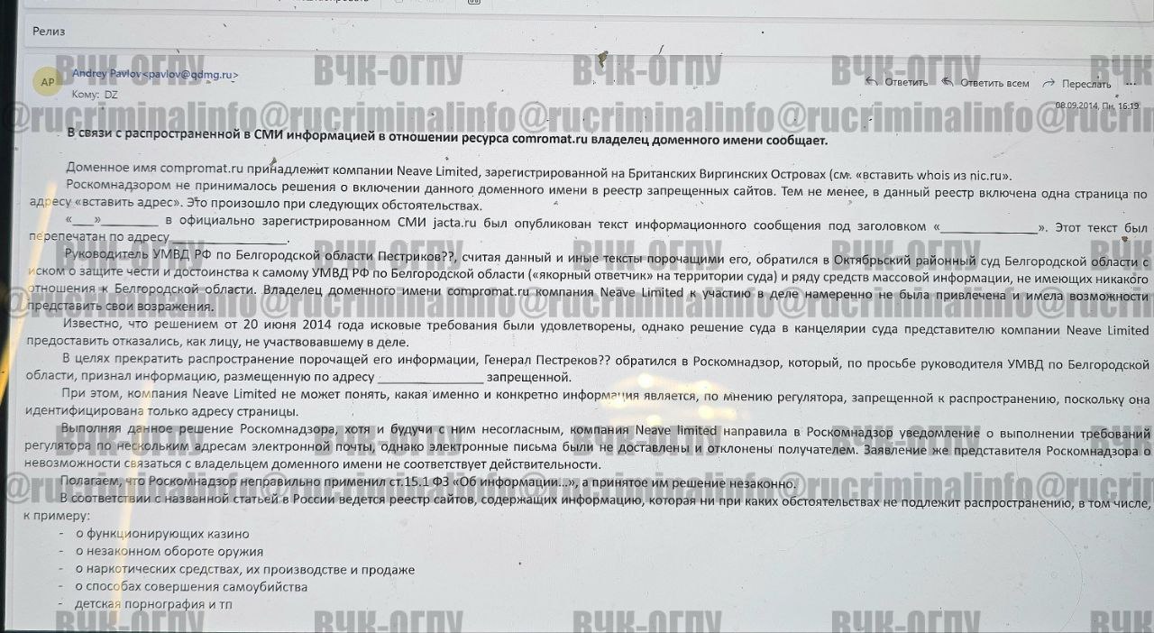 В архивах Павлова можно найти письма от Зуева, который все проблемы, которые возникали у Compromat.ru с Роскомнадзором, судами и т.д., перенаправлял Павлову. Павлов либо лично, либо с помощью своих подчинённых по «Кворуму», готовил ответы, письма, возражения от имени офшора Neave Limited, на который было зарегистрировано доменное имя Compromat.ru. А контактное лицо, которое называется от имени Neave Limited – это давние партнёры Кворума, Павлова, Зуева, Клюева, которые участвовали во многих их «операциях», в том числе в отношении клиентов из Казахстана.